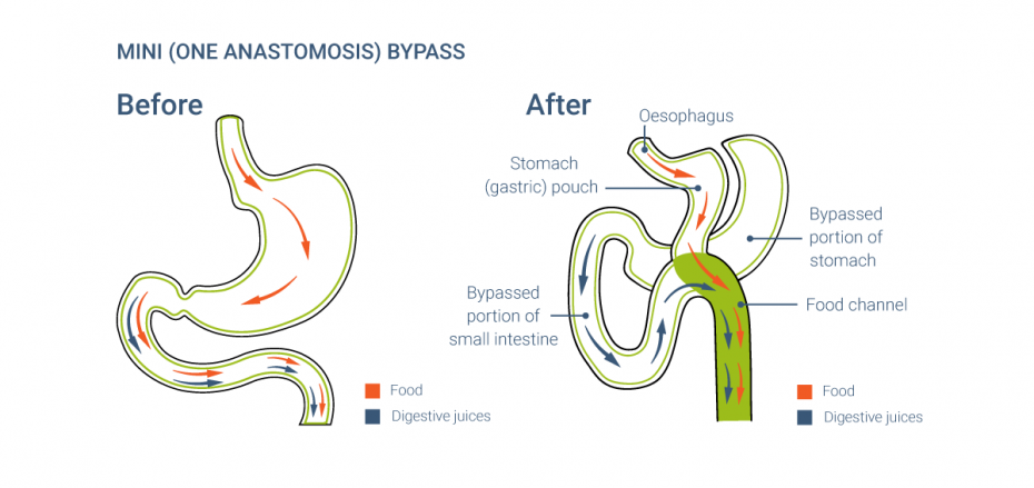 We offer two kinds of bypass, the classic roux en y gastric bypass (RYGB) and the more recently developed, one anastomosis gastric bypass (OAGB) also known as the ‘mini-bypass’. You can see the difference between them in these diagrams.